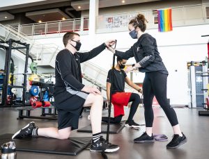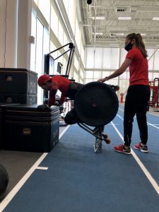 Goalball players Aaron Prevost and Aron Ghebreyohannes with strength coach Tessa Gallinger during a training session at the Canadian Sport Institute Calgary high performance facilities in Calgary, AB on March 26, 2021. (Photo: Dave Holland/CSI Calgary)