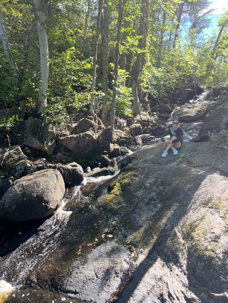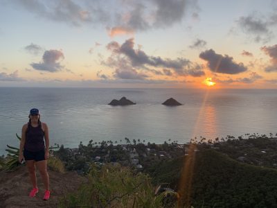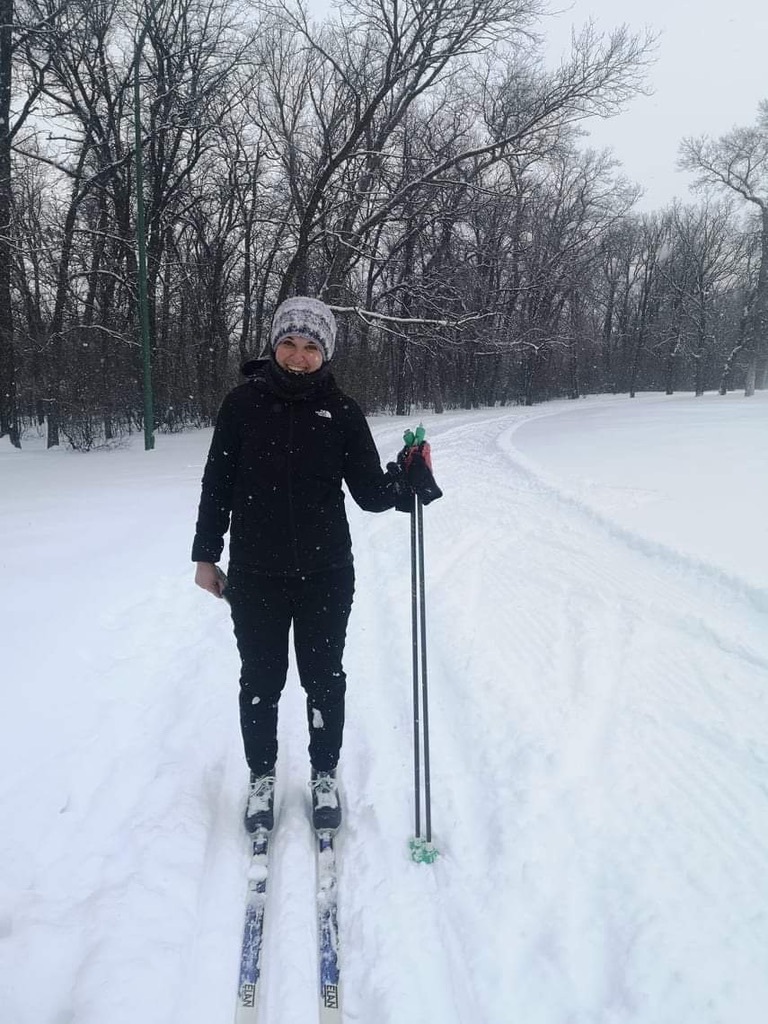 Photos. Image 1: Janelle XC skiing at Windsor Park Nordic Centre.  Image 2: Sunrise hike at Lanikai Pillbox on Oahu, Hawaii. Image 3: McGillivray Falls hike in Whiteshell Provincial Park.