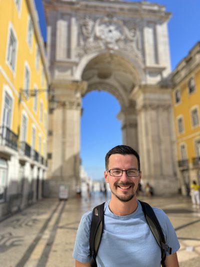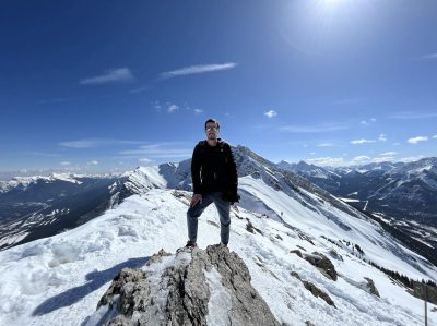 Photo Credit: Robyn Chase. Image 1: Jérémie stands atop Ha Ling Peak in Canmore, BC. Image 2: Jérémie in Lisbon
