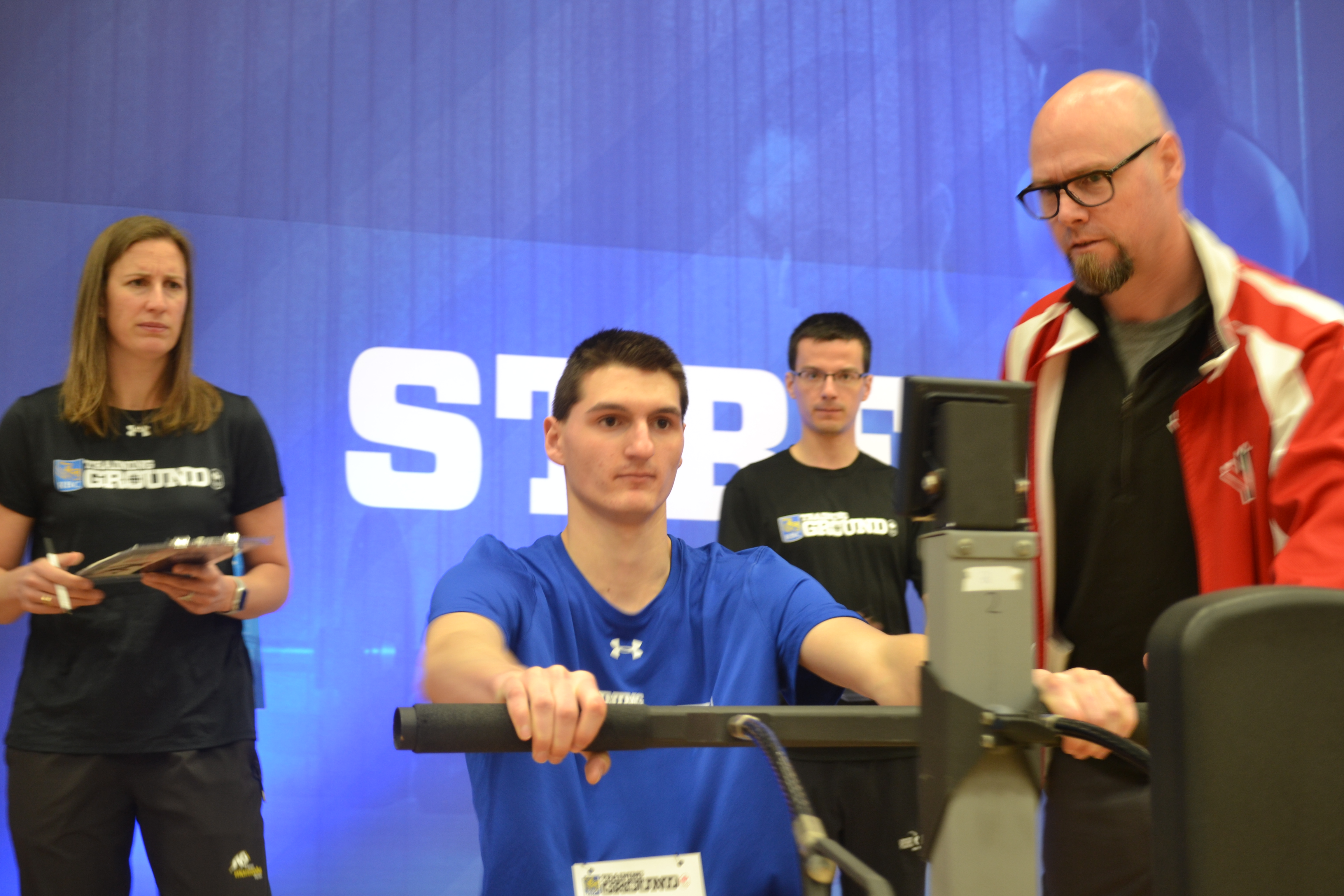 Olympic silver medallist Janine Stephens, CSCM’s Jérérmie Chase, and Rowing Canada coach Chuck McDiarmid look on as Jacob Ambroziak tests his strength.