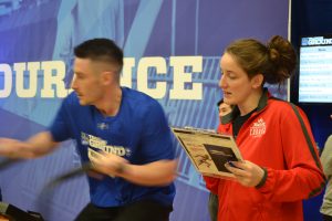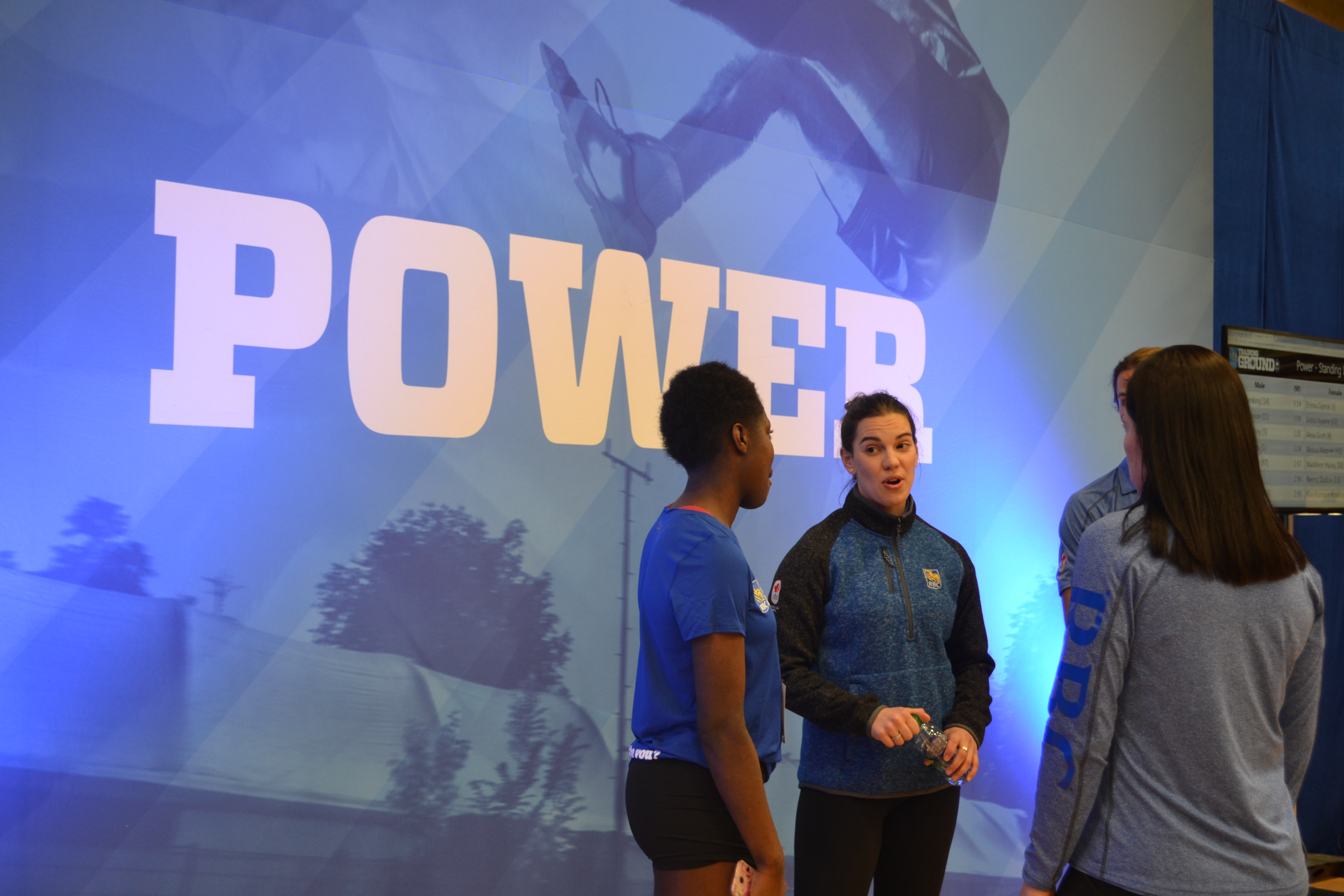 RBC Olympians Halli Krzyzaniak, James Lavallee, and Olympic champion Jill Officer chat with an athlete after she completes her testing.